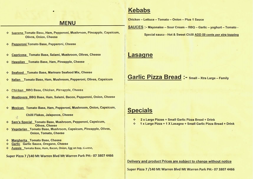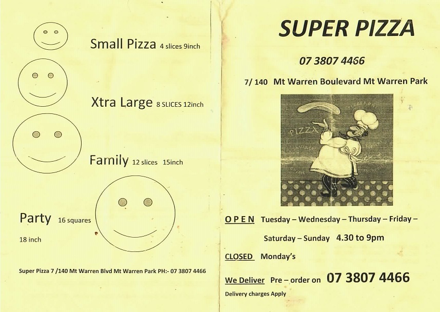 SUPER PIZZA MT WARREN PARK...Simply The Best Pizza in Beenleigh! Every time we go to order pizza from Super Pizza we can never find the menu.They don't have a website so I Created this page for me and anyone else who stumbles upon it to use.
